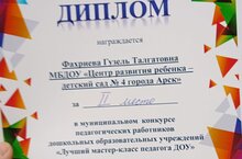 Муниципальный конкурс педагогических работников дошкольных образовательных учреждений "Лучший мастер-класс педагога ДОУ" прошёл сегодня в МБДОУ "Арский детский сад 2". Наш учитель- логопед Фахриева Гузель Талгатовна заняла 2 место в этом конкурсе. Поздравляем с победой!