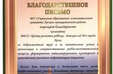 Наш детский сад получил Благодарственное письмо за добросовестный труд и за значительные успехи в организации и совершенствовании учебно- воспитательного процесса, формировании интеллектуального, культурного и нравственного развиттия подрастающего покаления.