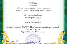 Прошёл конкурс "Я говорю и работаю по - татарски -2020". Конкурс проходил среди работников системы дошкольного образования, цель которого повышение профессионального мастерства и распространение опыта. Педагог - психолог нашего детского сада Журавлёва Алла Викторовна была награждена дипломом II степени.