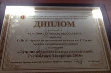 Гарипова Гульнара Фидаилевна – директор ГАПОУ «Арский педагогический колледж им. Г. Тукая» награждена дипломом МО и Н РТ в номинации «Лучшие образовательные организации Республики Татарстан 2016».