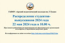 В целях оказания содействия в трудоустройстве выпускников, информирования о вакансиях и работодателях 22 мая 2024 года в 10.00 на базе ГАПОУ «Арский педагогический колледж имени Г.Тукая» (г.Арск, ул. Вагизовых, д.14, актовый зал) состоится распределение студентов-выпускников 2024 года для последующего трудоустройства с участием представителя МО и Н РТ.