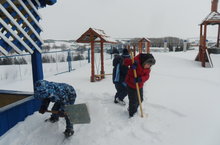 Кече яшьтән балалар хезмәткә өйрәнеп үсәләр. Нәниләр матур эш кораллары белән тирә-якны бик теләп кардан чистарталар.