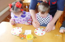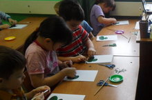 Балалар бакчасының кечкенәләр төркеме бик матур итеп, үз куллары белән тәлинкәне ябыштырып бизи. Үз эшләренә карап балалар да, аларның әтә-әниләре дә сөенә.