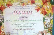 Нашему детскому саду был вручен диплом МУ "Управление образования" исполнительного комитета Арского муниципального района Республики Татарстан за участие в районном конкурсе детского творчества "Осенний калейдоскоп".