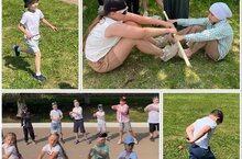 Дети участвовали в таких конкурсах как бег с яйцом в ложке, бег в мешках,перетягивание палки и бег с водой.