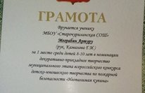Ученик 3 класса Меграбян Артур занял 1 место среди детей 8-10 лет в номинации декоративно-прикладное творчество муниципального этапа всероссийского конкурса детско-юношеского творчества по пожарной безопасности "Неопалимая купина". Поздравляем!