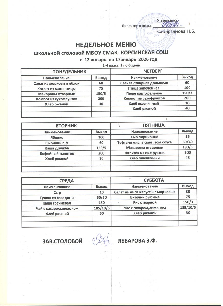 Меню на 12 января - 19 января 2026 года для 1-4 классов