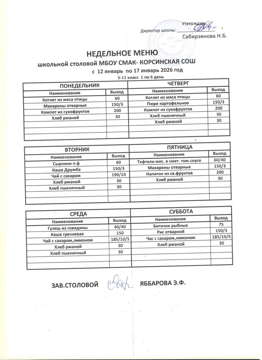 Меню на 12 января - 19 января 2026 года для 5-11 классов