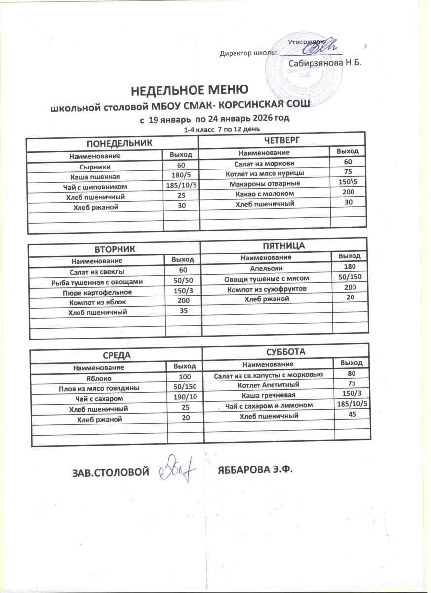 Меню на 19 января - 24 января 2026 года для 1-4 классов