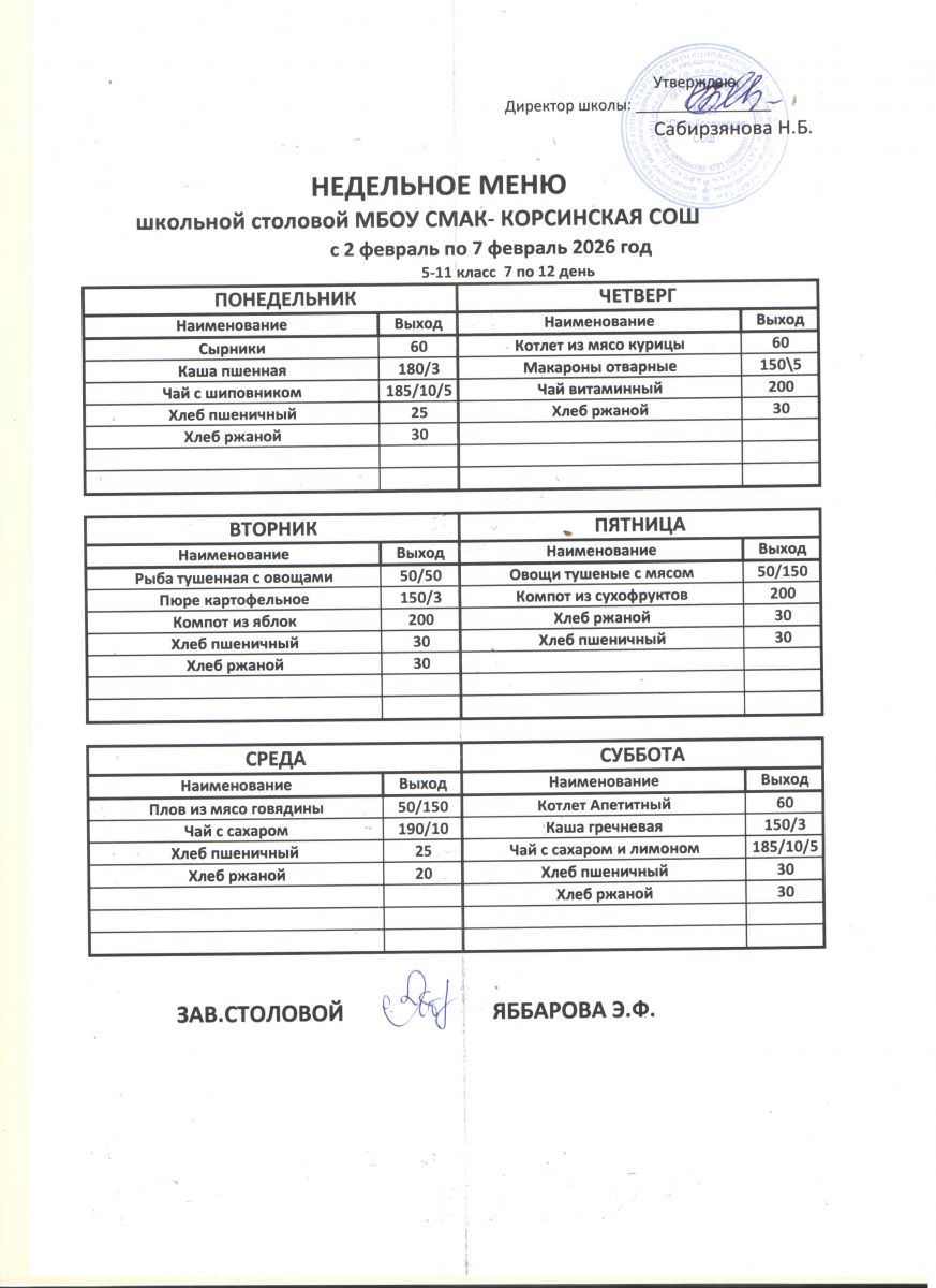 Меню на 26 января -31 января 2026 года для 5-11 классов