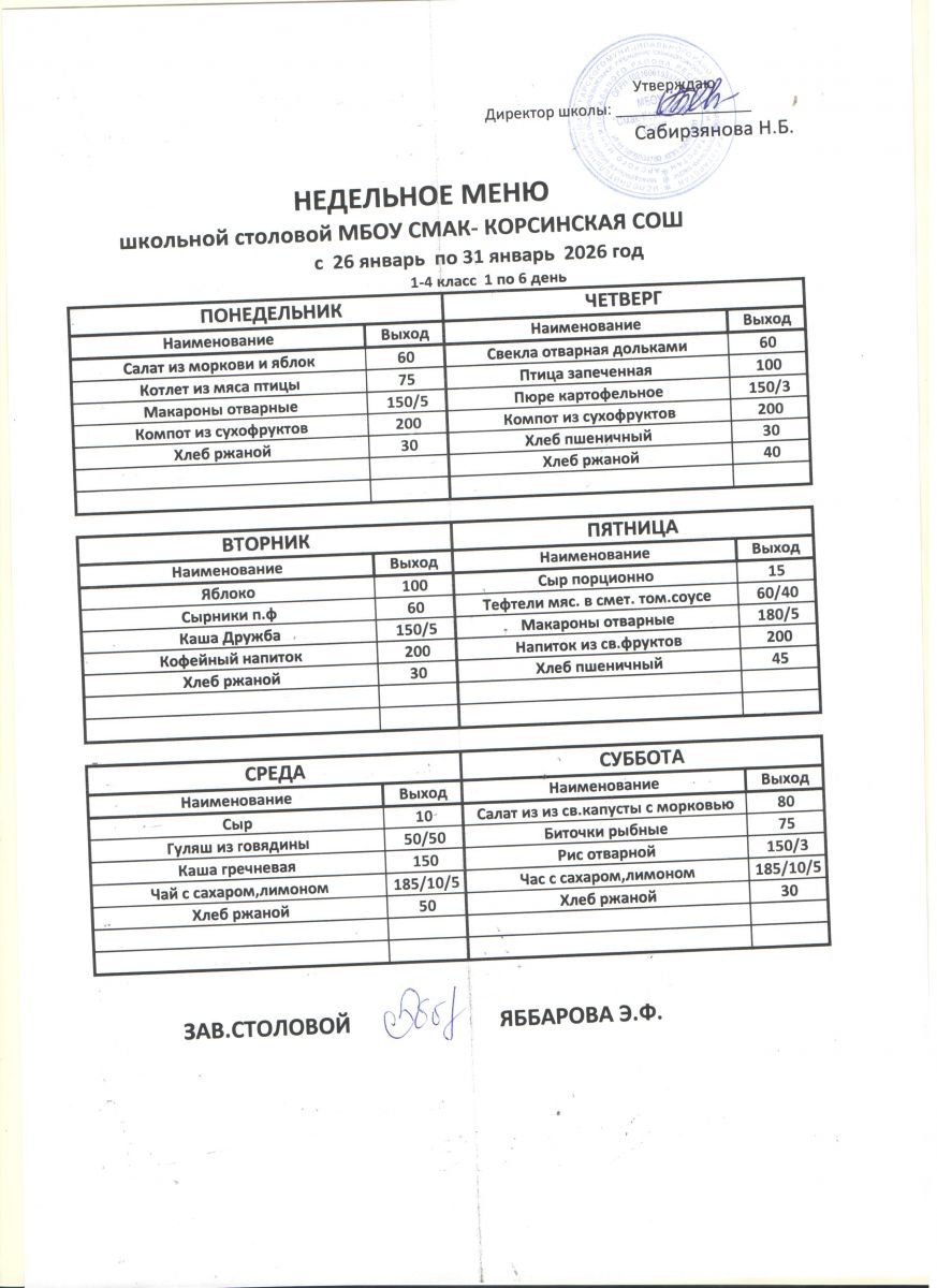 Меню на 26 января - 31 января 2026 года для 1-4 классов