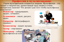 • Каждый мультфильм — это результат работы большой команды талантливых профессионалов: сценаристов, художников, режиссеров, аниматоров и звукооператоров.
