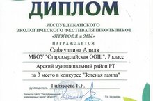 Декабрь аенда булып узган Республикакүләм экологик бәйгенең нәтиҗәләре билгеле булды. Конкурс нәтиҗәләре буенча 7 класс укучысы Сафиуллина Әдилә 3 урынга лаек булды, ә Сабирова Сара һәм Гилязетдинов Рәсим сертификатлар белән бүләкләнде. (җитәкче Гилязиева Г.Р.) Укучыларга уңышлар,молодцы!