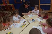 Сегодня на занятии рисования учили детей рисовать осенние листья, продолжали знакомить их с теплыми цветами спектра. Создали условия для художественного экспериментирования:показали возможность получения оранжевого цвета путём смешивания жёлтого с красным. Развивали чувство цвета и ритма.