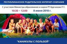 В соответствии с планом работы Министерства образования и науки Республики Татарстан 8 июня 2018 года в 10.30 состоится заседание Республиканского родительского интернет-собрания на тему "Каникулы с пользой". На повестке дня планируется рассмотрение вопросов организации летнего отдыха детей в 2018 году.