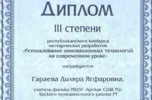 30 июня в ГАОУ ДПО "Институт развития образования Республики Татарстан" прошел очный тур Республиканского конкурса методических разработок "Использование инновационных технологий на современном уроке", на котором Гараева Д.Я. удостоилась Диплома III степени.