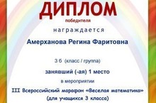 Стали известны результаты Всероссийского марафона "Веселая математика". Ученица 3 б класса Амерханова Регина (Учитель Халиуллина Оксана Анатольевна) заняла I место. Поздравляем с победой!