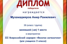 Стали известны результаты III Всероссийского марафона "Веселая математика". Ученик 3 б класса Мухамадияров Амир (учитель Халиуллина Оксана Анатольевна) занял I место. Поздравляем с победой!