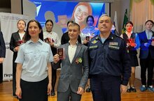 А руководитель местного отделения Движения Первых Лия Ильина подарила памятные подарки - обложки для паспорта от Движения Первых. -