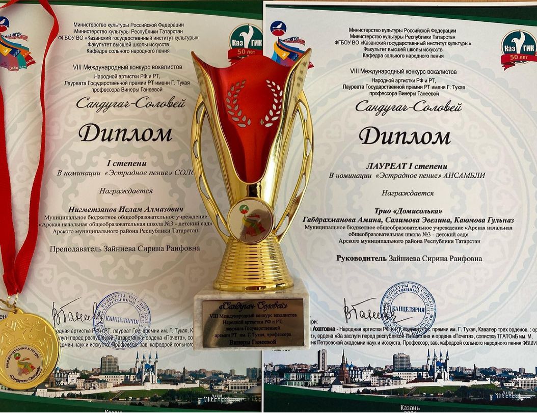 "Җыр - халык күңеленең көзгесе" Г.ТукайВокал түгәрәгенә йөрүче укучыларыбыз Нигъмәтҗанов И. һәм "Домисолька" триосы "Сандугач - Соловей" исеме астында узган VIII халыкара вокалчылар конкурсында катнашып 1 нче дәрәҗә дипломнарга лаек булдылар. укучыларны һәм вокал түгәрәге җитәкчесе Зәйниева Сиринә Раиф кызын лаеклы җиңүләре белән котлыйбыз. Афәрин!!! Алга таба да уңышлар теләп калабыз!