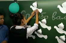 Ученики 6 б класса приняли активное участие в международном Едином часе духовности "Голубь мира". На голубях написаны имена погибших участников ВОВ и тружеников тыла.