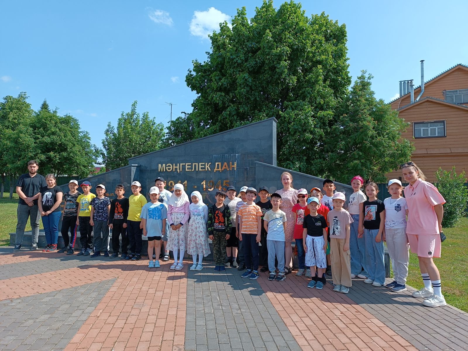 Сегодня в нашем школьном лагере прошел еще один интересный и увлекательный день под названием «День путешествий». После бодрящей зарядки ежедневно проходит линейка , где ребята знакомятся с планом на день, поднимают флаги РФ и РТ, после чего идут на вкусный завтрак . В «День путешествия» ребята побывали в парке Победы, где не только играли , а так же познакомились с экспонатами .