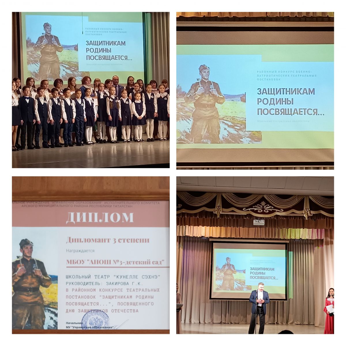 Сегодня состоялся церемония награждения победителей - школьных театральных коллективов по итогам районных конкурсов военно-патриотических театральных постановок «Защитникам Родины посвящается…» и «Юные Герои Великой Победы». Наш школьный театр "Күңелле сәхнә" занял 3 место! Поздравляем! Бүген «Ватанны саклаучыларга багышлана» хәрби - патриотик театр спектакльләренең район конкурслары нәтиҗәләре буенча җиңүчеләрне-мәктәп театр коллективларын бүләкләү тантанасы булды. Безнең "Күңеле сәхнә" театры коллективы 3 нче урынны алды!Котлыйбыз!