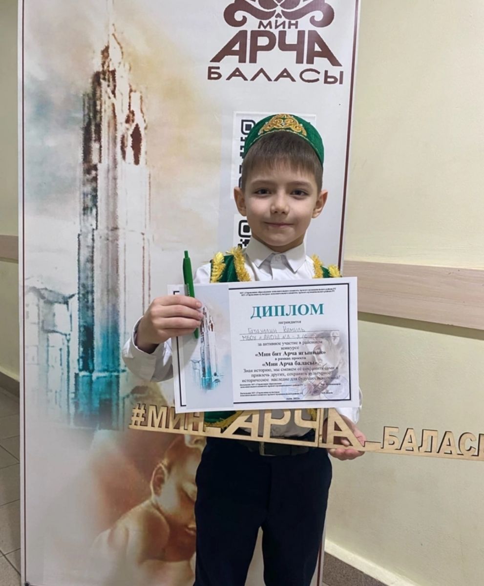 ????Ученик 3 класса Гатауллин К. принял участие в районном конкурсе « Мин бит Арча ягыннан» в рамках проекта «Мин Арча баласы". Молодец!