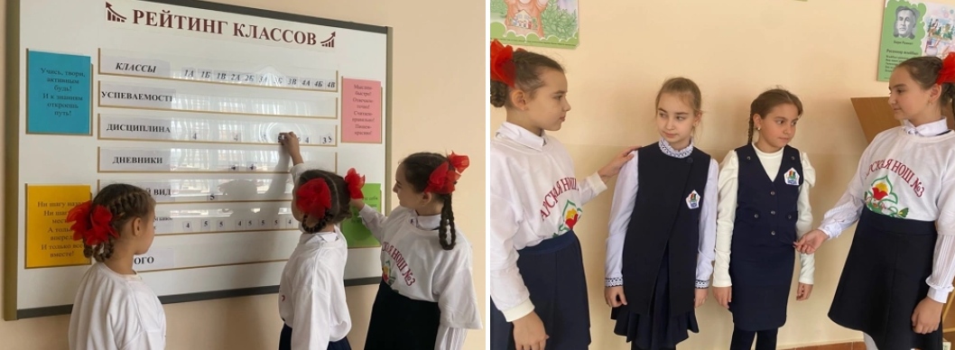 В настоящее время важное место в воспитательном–образовательном процессе школы занимает развитие ученического самоуправления. В рамках этого в нашей школе работает «Актив школы» , который проводит рейтинг классов по разным категориям . И сегодня учащиеся проверили внешний вид , дневники у учащихся , оценили по 5-бальной шкале .