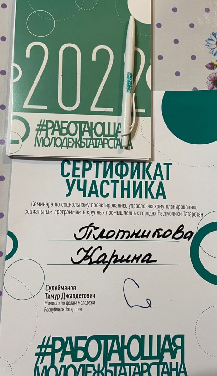 «2019-2025 елларга Татарстан Республикасында яшьләр сәясәтен үстерү» дәүләт программасының «2019-2025 елларга Татарстан Республикасында яшьләр сәясәтен үстерү» ярдәмче программасын гамәлгә ашыру кысаларында Татарстан Республикасы Яшьләр эшләре министрлыгы «Татарстан Республикасы Предприятиеләр һәм оешмалар яшьләр берлеге» төбәк иҗтимагый оешмасы белән берлектә «Арча шәһәре эшче яшьләре өчен Социаль проектлау, идарә планлаштыру, социаль программалар» өйрәтү семинары (алга таба – Семинар) үткәрде. Семинар 2022 елның 25 ноябрендә 09.00 сәгатьтән 18.00 сәгатькә кадәр Г. Тукай исемендәге Арча педагогика көллиятендә узды. Семинарның максаты-эшче яшьләргә карата ТР эшче яшьләренең учреждениеләрендә, предприятиеләрендә, оешмаларында һәм икътисади активлыгында тормышка ашырыла торган яшьләр сәясәтенең нәтиҗәлелеген арттыру. Семинарда безнең педагог К. и. Плотникова катнашты