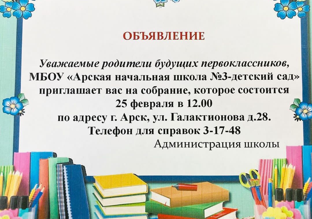 Уважаемые родители будущих первоклассников, приглашаем вас на собрание, которое состоится 25 февраля в 12.00. -