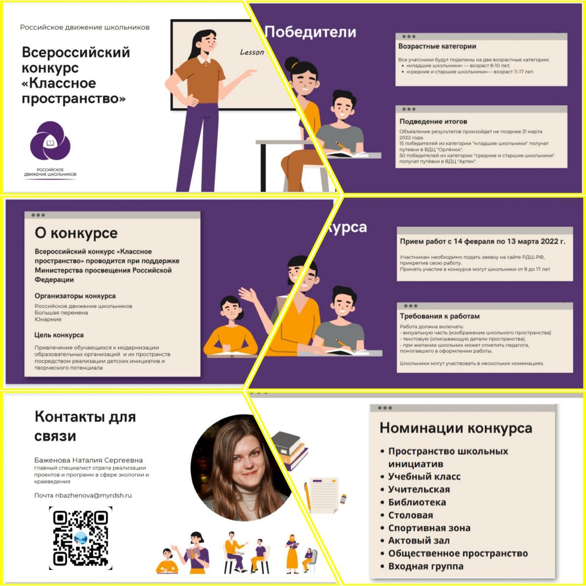 Министерство просвещения Российской Федерации информирует о проведении с 14 февраля по 31 марта 2022 г. Всероссийского конкурса «Классное пространство» (далее – Конкурс). Целью Конкурса является привлечение обучающихся образовательных организаций Российской Федерации к модернизации образовательных организаций и их пространств. Организаторы Конкурса - Общероссийская общественно-государственная детско-юношеская организация «Российское движение школьников», Всероссийское детско-юношеское военно патриотическое общественное движение «ЮНАРМИЯ» и автономная некоммерческая организация «Большая перемена» при поддержке Министерства просвещения Российской Федерации. Конкурс проводится на платформе Российского движения школьников