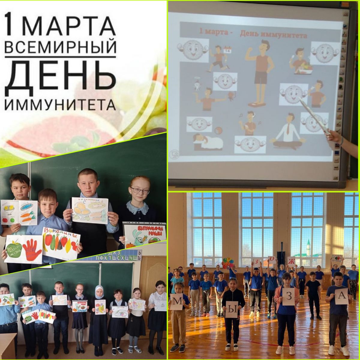 Ел саен, 2002 елдан башлап, Бөтендөнья сәламәтлек саклау оешмасы инициативасы буенча, 1 мартта Бөтендөнья иммунитет көне билгеләп үтелә, аның максаты - төрле иммун авыруларның таралуына, шулай ук иммунитетны саклау һәм ныгыту проблемаларына җәмәгатьчелек игътибарын җәлеп итү. Укучылар белән әңгәмәләр үтте.Ежегодно, начиная с 2002 года, по инициативе Всемирной организации здравоохранения, 1 марта отмечается Всемирный день иммунитета, целью которого является привлечение внимания общественности к распространению различных иммунных заболеваний, а также к проблемам сохранения и укрепления иммунитета.Проводились беседы с учащимися..