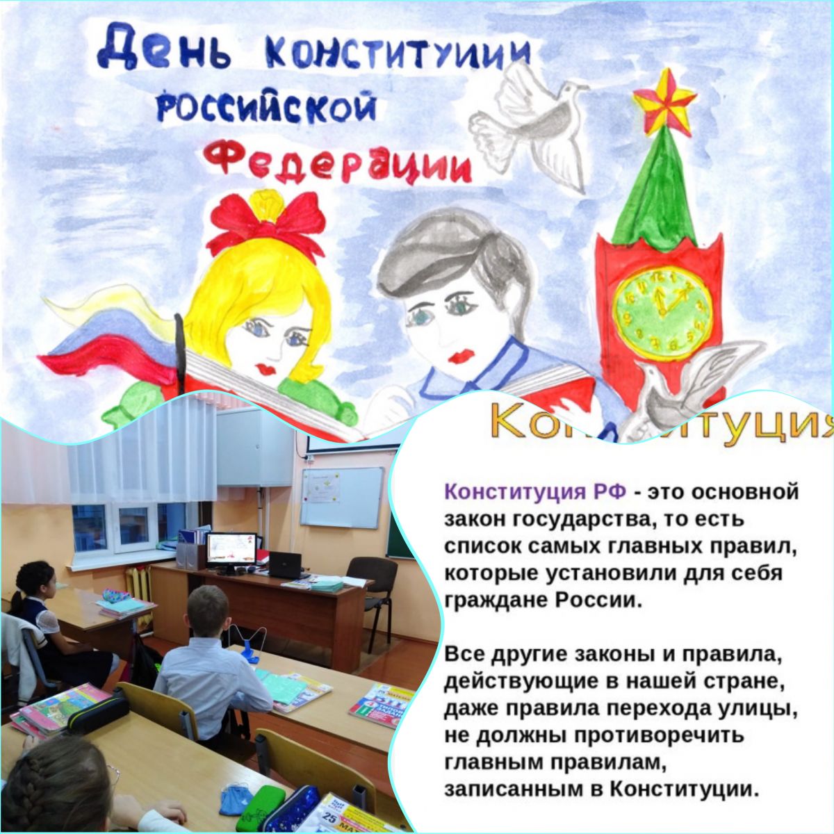 12 декабря – День Конституции. 12 декабря 2020. День Конституции Российской Федерации – главный государственный праздник нашей страны. Конституция РФ – это Основной закон государства, имеющего славное прошлое и великое будущее. Он символизирует силу и независимость нашей страны. Конституция Российской Федерации была принята 12 декабря 1993 года, именно потому эта дата стала государственным праздником. В честь этого прошли классные часы, беседы в ГПД, и конкурс рисунков. -
