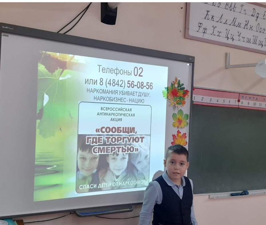 В рамках проведения Всероссийской акции "Сооби где торгуют смертью" вшколе прошли класные часы на тему "Скажем наркотикам нет". ребятам говорили о здоровом образе жизни, о влиянии на организм вредных привычек, в том числе наркотических средств. Детскому вниманию был представлен видеоролик "Нет наркотикам!", после которого ребята смогли определить какими качествами характер должен обладать человек, чтобы устоять от соблазна."үлем белән кайда сәүдә итәләр" Бөтенроссия акциясен үткәрү кысаларында мәктәптә "Наркотикларга юк дип әйтик"дигән темага сыйныф сәгатьләре узды. балаларга сәламәт яшәү рәвеше, организмга зарарлы гадәтләрнең, шул исәптән наркотик чараларның йогынтысы турында сөйләделәр. Балалар игътибарына " Наркотикларга юк!аннан соң балалар, алдаудан арыну өчен, кешенең нинди сыйфатларга ия булуын билгели алдылар.