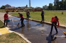 Четвёртый день работы лагеря труда и отдыха «Трудовой десант» начался с линейки и утренней зарядки. После завтрака начался рабочий процесс. Ребята с большим желанием мыли асфальт от рисунков мелом. Готовили территорию для новых конкурсов. Затем девочки полили цветы и деревья. В конце рабочего дня все активно подзарядились играми на свежем воздухе.