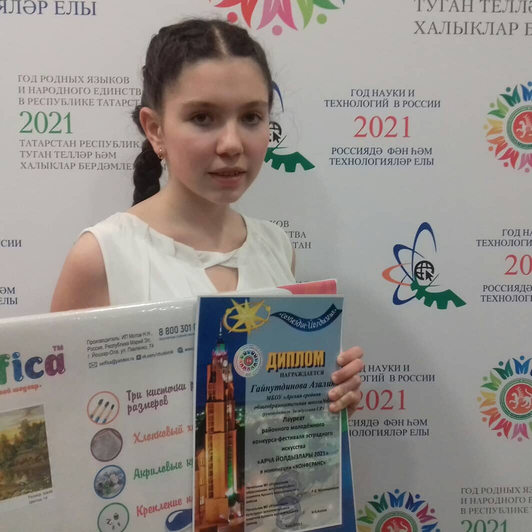 Гайнутдинова Азалия , ученица 5А класса, стала Лауреатом молодёжного конкурса-фестиваля эстрадного искусства "Арча йолдызлары - 2021" в номинации "Конферанс" (руководитель Загидуллина Г.Р. ) -