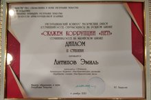 Ученик 7 класса Антипов Эмиль награжден дипломом второй степени в конкурсе творческих работ (сочинений эссе) на родном языке "СКАЖЕМ КОРРУПЦИИ "НЕТ!"