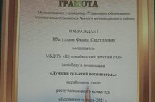 Тэрбиячебез Ибатуллина Ф.С. "Воспитатель года 2021" конкурсына катнашып, "Лучший сельский воспитатель"номинациясендэ мактау грамотасы белэн булэклэнде..