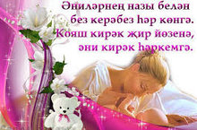 Бәйрәм белән,ӘНИЛӘР! 29.11.2015 Кадерле әниләр!Сезне якынлашып килүче Әниләр бәйрәме белән тәбрик итәбез.Сез – яклаучы да, саклаучы да, барыр юлны яктыртып торучы мәңге сүрелмәс кояш та. Сез булган җирдә ризык бар, җылы бар. Бердәнбер иң кадерле, иң хөрмәтле, иң якын кешеләребез - Әниләр! Балаларыгыз турында гел яхшы сүзләр генә ишетеп яшәргә язсын Сезгә! Без бит беләбез: әниләр өчен моңардан да зуррак бәхет юк! Матур булсын, котлы булсын бәйрәмегез!