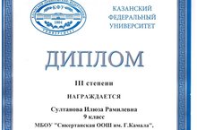 15 нче апрель көнне Россиянең иң зур фәнни уку-укыту комплексларыннан берсе булган Казан федераль университетының тарихи бинасында регионара предмет олимпиадаларының җиңүчеләрен һәм призерларын бүләкләү тантанасы узды.Укучыларны университет бинасы белән таныштырдылар һәм химия, физика, тарих музейларына экскурсия оештырдылар. Күренекле галимнәр белем биргән Университет залларыннан үтү, җиңүчеләрне тәбрикләү тантанасына катнашу күңелләрдә зур тәэсир калдырды. Тантаналы чарада җиңүчеләрне уку йортының җитәкчеләре һәм галимнәре тәбрикләде. Мәктәбебезнең 9 нчы сыйныф укучысы Солтанова Илүзә Рамил кызы татар теленнән җиңүче булып III дәрәҗә диплом белән бүләкләнде. Аны чын күңелебездән тәбрик итәбез!