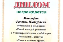 Ученик 9 класса нашей школы Минсафин Фанзиль участвовал в V Конкурсе молодых комбайнеров Республики Татарстан "Славим человека труда" и стал победителем в номинации "Самый молодой участник". Был награжден дипломом и ценными подарками. Поздравляем с победой и желаем дальнейших успехов.