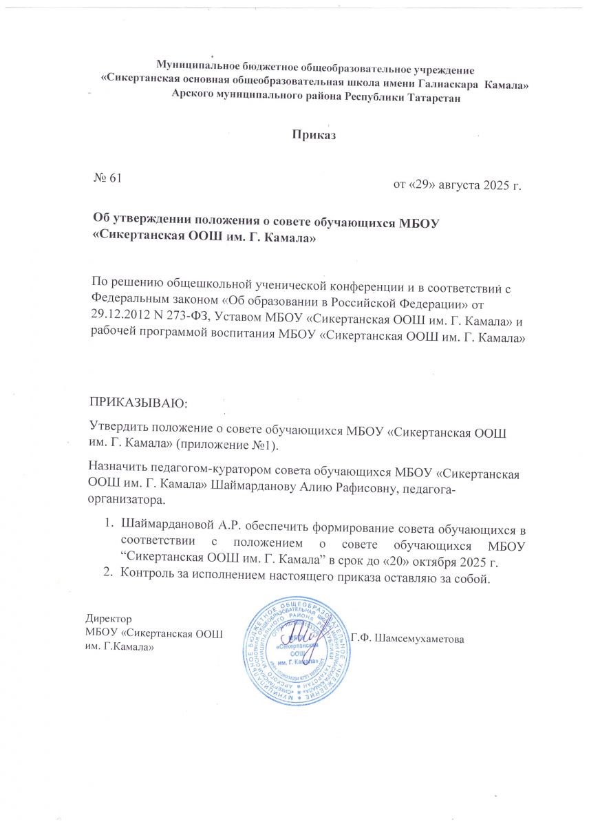 Приказ директора о создании совкта обучающихся на 20250-2026 учебный год
