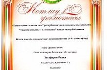 "Туган телем - гаиләм теле" республикакүләм конкурсы кысаларында "Гаиләм язмышы-ил язмышы" иҗади эшләр бәйгесенең "Безнең нәселдә олы шәхесләр" номинациясендә (6-8 сыйныфлар) 3нче урынны алган Радил Загафаров Арча районы мәгариф идарәсенең Котлау грамотасы белән бүләкләнде Җитәкчесе-Гөлүсә Җәләлиева