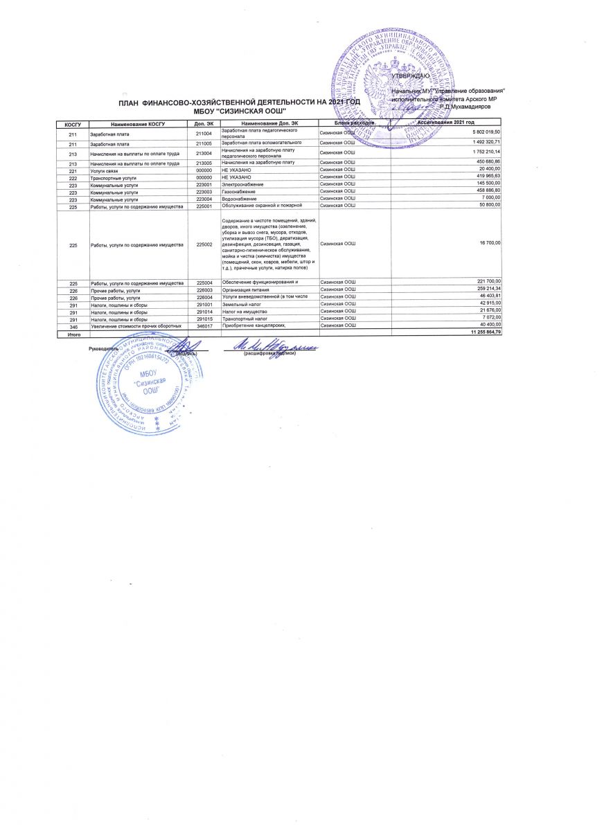 Финансово-хозяйственная деятельность МБОУ "Сизинская ООШ", 2021 год
