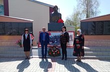 Җиңү көне уңаеннан һәйкәлгә венок салынды. Әлеге чарада Гөлнара Фидаилевна белән Рәмзия Рамазановна да катнашты.