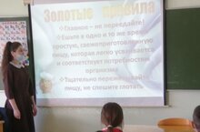 В рамках Всероссийской социальной акции "Здоровое питание школьника" ученица 8 класса Рахматуллина С. провела с учащимися 5-7 классов интерактивное занятие по правильному питанию "Я есть то, что я ем". Задачи урока: расширить знания учащихся о здоровье, познакомить подростков с основами и правилами здорового питания, познакомить подростков с пословицами и поговорками о правильном питании.