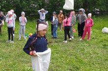 Җәйге табигать гүзәллегенә таң калып, елга буена экскурсиягә төштек. Саф һавада хәрәкәтле уеннар уйнадык.