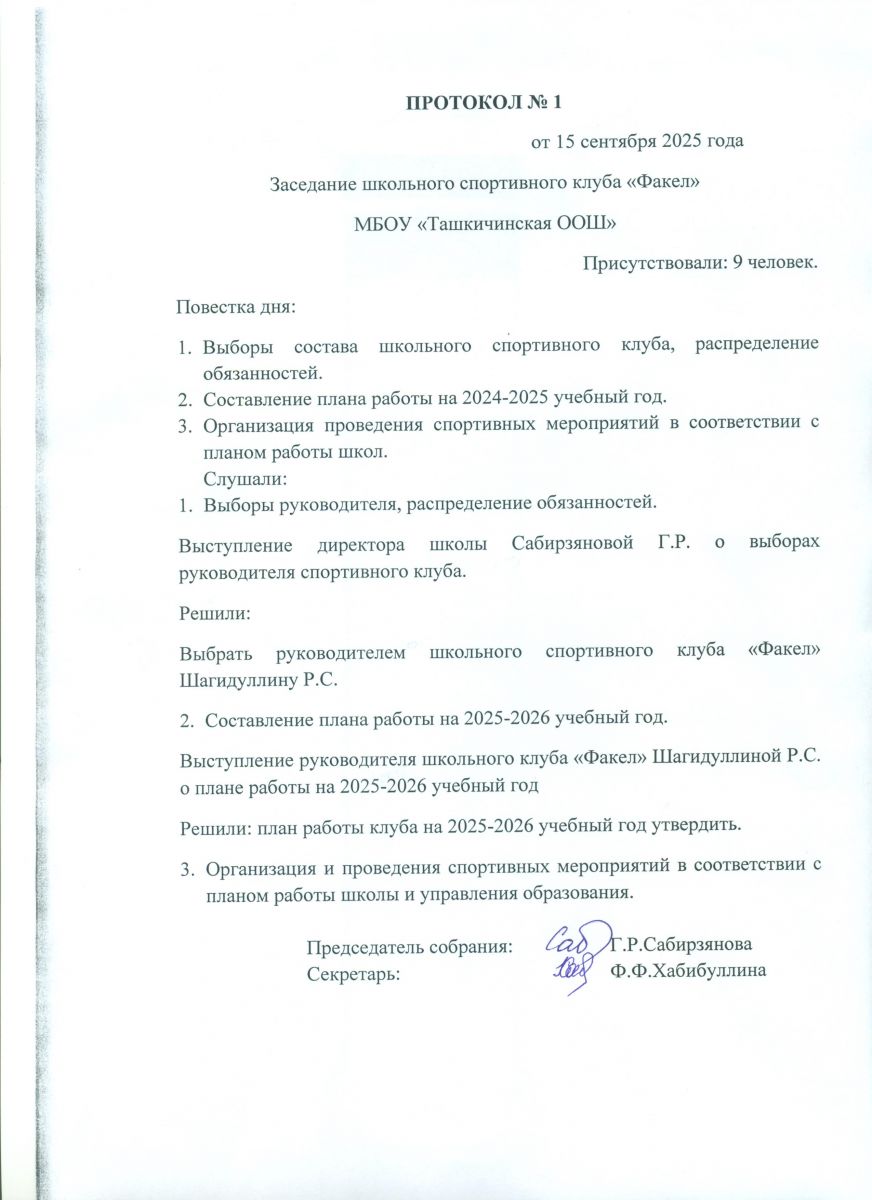 ПРОТОКОЛ Заседания школьного спортивного клуба «Факел»
