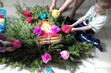 Бөек Ватан сугышында ятып калган авылдашларыбыз хөрмәтенә куелган һәйкәл янына кую өчен венок ясыйбыз.